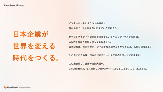 この度のシリーズAラウンドの一環である資金調達を契機に、Cloudbaseはさらなる技術・組織開発や人材採用の促進を目指していく考えです。「日本企業が、世界を変える時代をつくる。」をミッションに、今後も事業を加速させていきます。