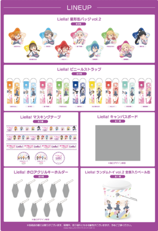 1回600円(税込)。Liella! 星型缶バッジ vol.2(全9種)、Liella! ビニールストラップ(全9種)、Liella! マスキングテープ(全3種)、 Liella! キャンバスボード(全1種) Liella! ホロアクリルキーホルダー(全9種)、 Liella! ランダムトイ vol.2 全部入りペール缶(全1種)のなかからいずれかが当たるランダムトイ。ランダムトイはアプリ「HARAJUKU」をダウンロードしていただき、原宿のチェックインスポットにチェックインをすることで引けるようになり、期間中、 「原宿friend」 「原宿竹下通り友竹庵」の2箇所にて商品交換が可能です。