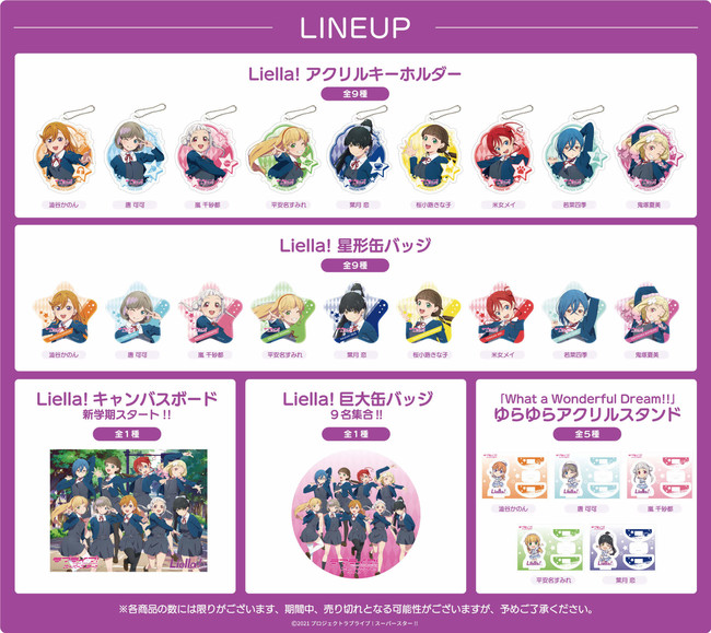 1回600円(税込)。Liella! アクリルキーホルダー(全9種)、Liella! 星型缶バッジ(全9種)、Liella! キャンバスボード 新学期スタート!!(全1種)、Liella! 巨大缶バッジ9名集合!! (全1種)、「What a Wonderful Dream!!」ゆらゆらアクリルスタンド(全5種)のなかからいずれかが当たるランダムトイ。ランダムトイはアプリ「HARAJUKU」をダウンロードしていただき、原宿のチェックインスポットにチェックインをすることで引けるようになり、期間中、 「原宿friend」 「原宿竹下通り友竹庵」の2箇所にて商品交換が可能です。