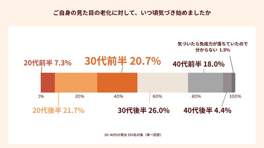 ●また、見た目の老化に関しても気づき始めたのは30代が46.7%(30代前半20.7%、30代後半26.0%)となっており、30代は外面の変化に加え、内側の免疫も曲がり角を迎える起点であることが浮き彫りになった。