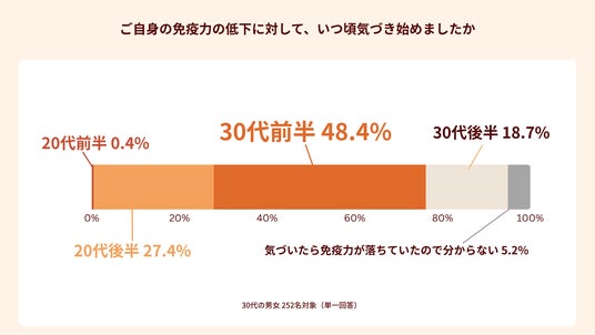 ●実際に30代の48.4%が「30代前半」から免疫低下を自覚しており、これは見た目の老化を意識し始める時期と重なっている。