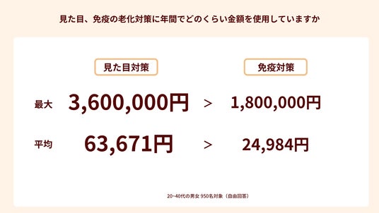 ●一方、外見、免疫、それぞれの老化対策に年間で費やしている費用を聞いたところ、平均金額の比較で外見の対策(63,671円)には免疫の対策(24,984円)の約2.5倍にあたる費用を費やしていることがわかった。