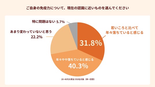 日本最大級の観便・腸活サポートアプリ「ウンログ」を運営するウンログ株式会社は、腸内細菌学研究の第一人者である京都府立医科大学大学院医学研究科 生体免疫栄養学講座 教授、消化器内科学 特任教授の内藤裕二先生監修のもと、30代から加速する「免疫老化」への正しい理解を深め、効率的な健康管理を提案するべく、全国の20~40代の男女950名を対象に「免疫と老化に関する意識調査」を実施しました。