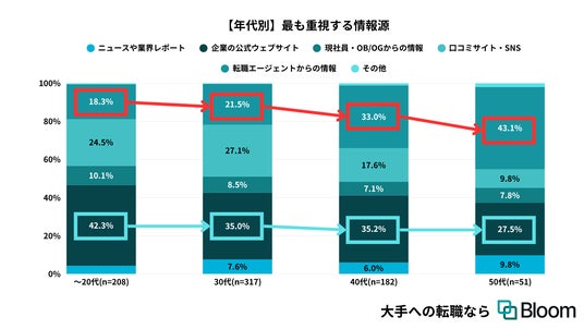 年代別の傾向としては、若年層ほど「企業の公式ウェブサイト」を重視するのに対して