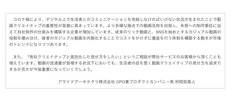 ソーシャルテクノロジーによる生活者マーケティングの実現を支援するアライドアーキテクツ株式会社(東京都渋谷区、代表取締役CEO:中村壮秀、証券コード:6081)は、デジタルマーケティングにおける動画活用の意識を調査するため、「企業のデジタルマーケティング施策における動画活用の実態調査2021」としてインターネットリサーチを実施し、全国20~50代の会社員および経営者のなかで業務において「動画コンテンツ」を活用した施策を実施したことがある217名が回答しました。