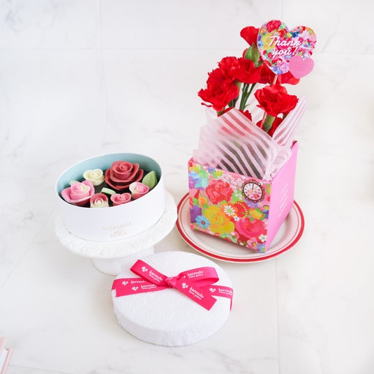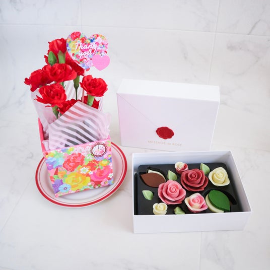 手紙の形を模したデザインが印象的な「レトル フルーリ」は、先日登場した新作チョコレート。そんな可愛いチョコレートと、カラフルなデザインBOX入りのカーネーションポットがセットになったオンライン限定の人気ギフトです。異なるサイズのお花や葉がデザインされた華やかなチョコレートボックスには、8種類のフレーバーを詰め合わせ、様々な味を少しずつ楽しみたいお母さんへの贈り物にぴったりです。