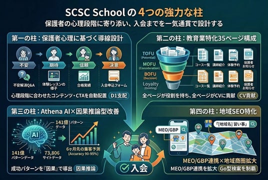 本サービスは、Athena AI(141億件の行動データを持つ因果推論エンジン)・独自の3D-CMF理論・OWLet CMS(500万パーツ・15年間脆弱性ゼロ)・77's Check!!・SCSC Legalという5つのコア技術を統合し、教育業界に特化した「育てるサイト」として設計されています。