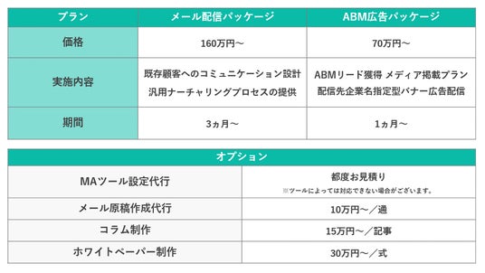 メール配信パッケージとABM広告パッケージの2つを基本プランとしています。オプションにて、MAツールの設定代行や各種コンテンツの制作も行います。