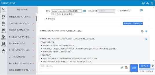 図. 生成AIアシスタント画面イメージ(左側メニューから翻訳他の業務を選定、画面上部から生成AIモデルの選択が可能)