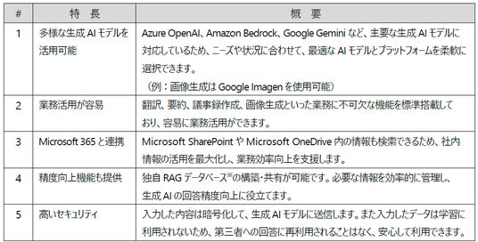 日立ソリューションズ・クリエイトの生成AI環境(生成AIアシスタント)は、以下の特長があります。