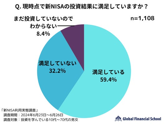 「現時点での投資結果に満足していますか?」の質問に対して、「満足している」59.4%、「満足していない」32.2%、「まだわからない」8.4%という結果で、満足している人が約6割となりました。
