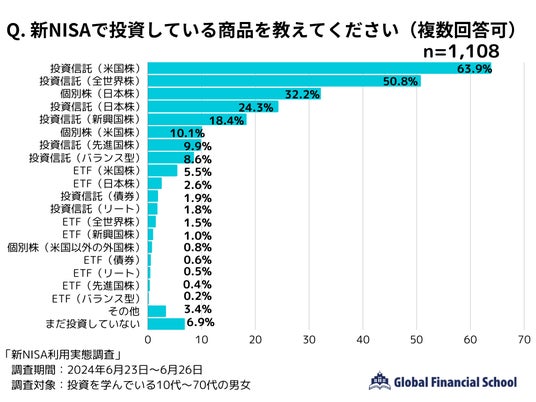 新NISAで投資している商品TOP5は「投資信託(米国株)」が63.9%「投資信託(全世界株)」が50.8%