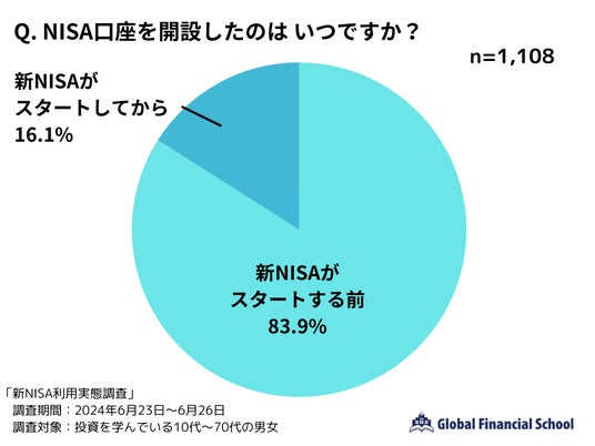 「NISA口座を開設している」と回答した1,108人に口座開設時期をお聞きしたところ、「新NISAがスタートする前」と回答した人が83.9%、「新NISAがスタートしてから」と回答した人は16.1%でした。