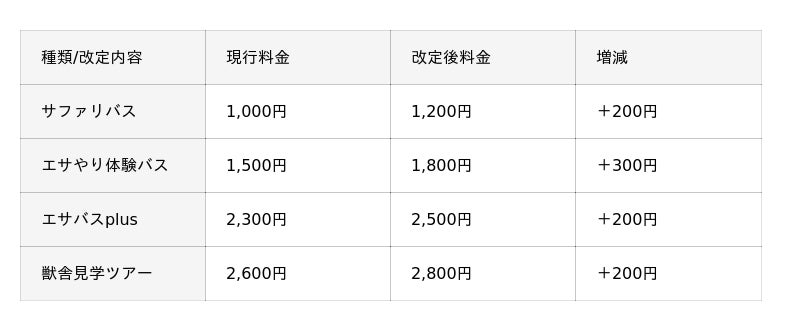 動物を間近で観察できる人気の「サファリバス」「エサやり体験バス」「獣舎見学ツアー」などの園内周遊バスについても、人件費や車両の維持費・燃料費の上昇を受け料金を改定いたします。