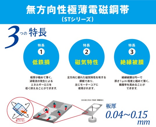 モータの小型化ニーズに対応し、高回転化・高効率化を両立する無方向性極薄電磁鋼帯STseries