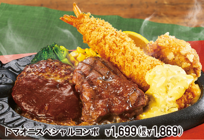 ハンバーグ・ステーキ・エビフライ・唐揚げと子供から大人まで誰もが大好きなメニューだけを集めた、トマオニ初の4連コンボメニューは食べ応え抜群。満足感も4倍に!!食べ盛りの10代~20代の方に特におすすめです。