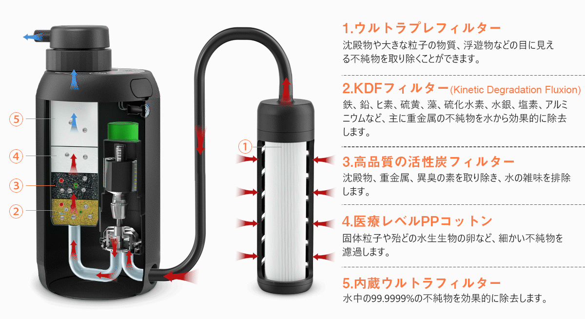 フィルターは、取り外し可能な設計となっており、古いフィルターを簡単に交換することができます。Greeshowの浄水器は、大容量バッテリーを搭載し、連続で1000L以上の水を濾過できます。独自の「5段階浄水システム」の仕組みをご紹介致します。