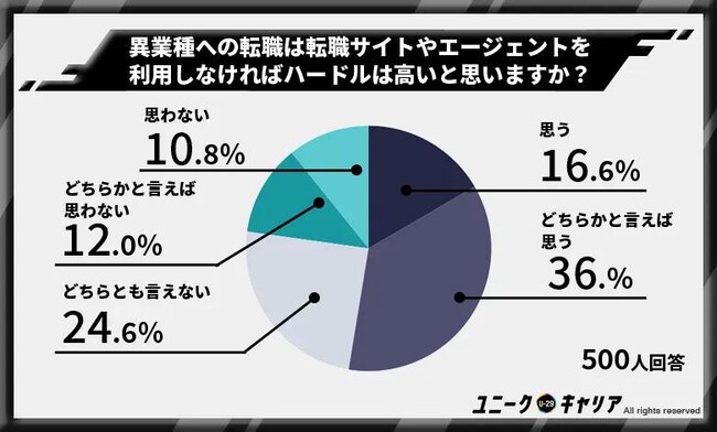 「(ハードルが高いと)思う」と回答した16.6%と合わせると52.6%となり、半数以上の人が、転職サイトやエージェントを使わないと異業種への転職はハードルが高いと感じていたことが明らかになった。