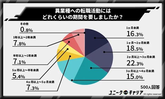 一方、異業種への転職活動に要した期間は、6割近くの人が3ヶ月未満と答えている。