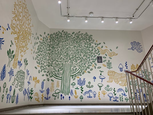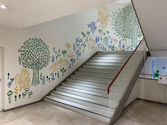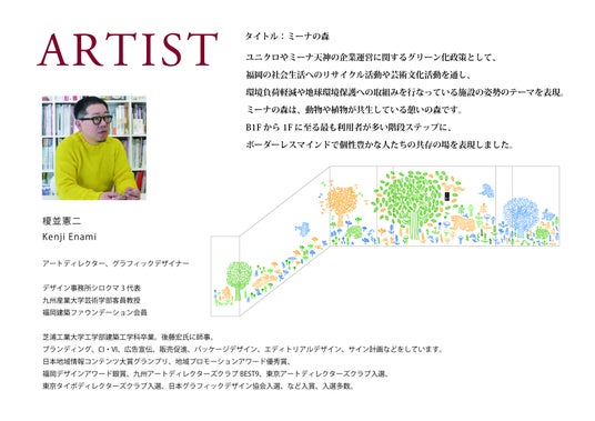 「ミーナ天神」及び「ファーストリテイリング」が取り組む、グリーン化活動やリサイクル活動、芸術文化活動を通し、環境負荷軽減や地球環境保護への思いを「ミーナの森」というテーマで表現しています。「ミーナの森」は、動物や植物が共生している憩いの森です。1階から地下1階に至る利用者が多い階段壁面に、ボーダーレスマインドで個性豊かな人たちの共存の場を表現しました。