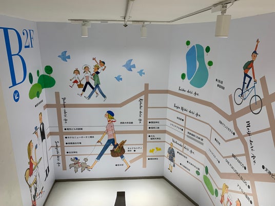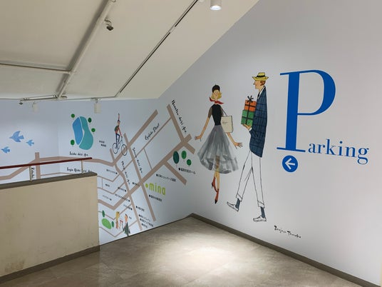 地下1階「ミナチカSTREET」から地下2階「駐車場」へつながる壁面には、地元で活躍するイラストレーターのボンジュール トモコ氏とアートディレクターの垣田健壱郎氏とのコラボレーションによるウォールアート「街と人をつなぐ」が誕生いたしました。