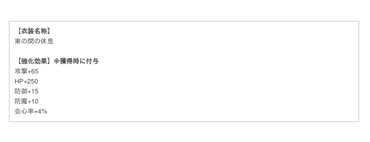 また、新衣装「束の間の休息」を獲得すると「主人公」に強化効果も付与されますので、ぜひこの機会をお見逃しなく!