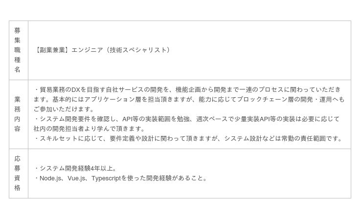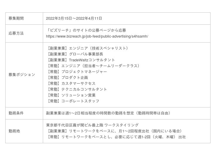 トレードワルツの中核メンバーは、現在、出資企業からの出向者や転籍者を中心に、プロパー社員を加える形で構成されています。しかし、今後の本格的な製品展開に加え、日本や海外政府も巻き込んだ貿易DXという世界を舞台とした挑戦を行うには、豊富な経験やスキルを持つビジネスプロフェッショナルを、社内にとどまらず日本中から登用することが有効です。多くのユーザーやアライアンス先から寄せられる開発・API連携・導入要望をスピーディーに実現するべく、優秀なエンジニア、ITサポート人材、それもエース級の人材を求めていますが、そうした人材はすでに重要なポジションで活躍していることがほとんどのため、兼業・副業というスタイルで募集をいたします。昨年5月にも兼業・副業を中心にビジネス系の21名採用をしていてそのメンバーが活躍しておりますが、今回はさらに事業を加速させるべく追加で募集いたします。