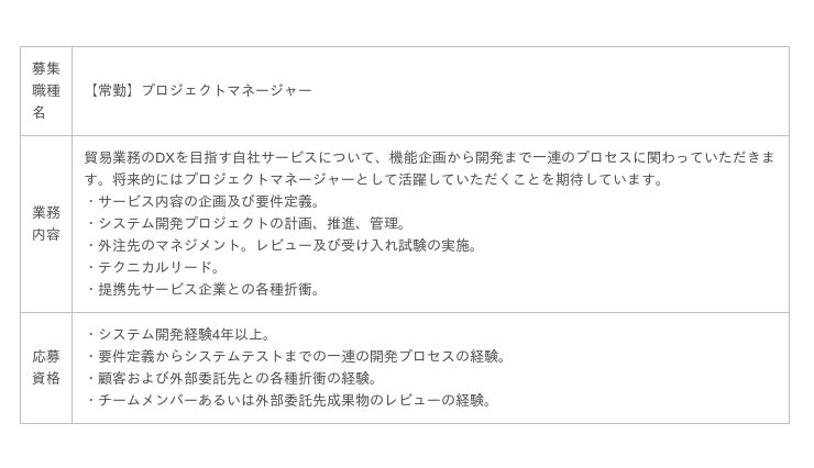 この高い目標を成し遂げるには、世界で戦うサッカー日本代表のように、今どこに勤めているか、どのチームに所属しているかは関係なく、日本中から才能を持つ方を集める必要があり、今回の「ビズリーチ」での公募に至りました。「日本発で世界を変える貿易DXを成し遂げる夢」にともにチャレンジしていただける方が、大企業、コンサルティング会社、スタートアップ、政府機関やその他幅広い業界からご応募してくださるのをお待ちしております。