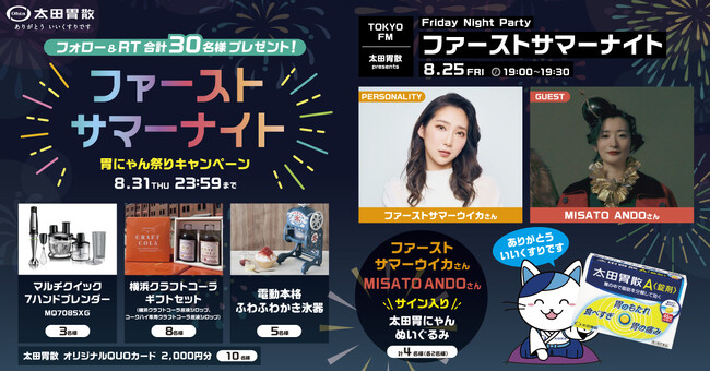 本キャンペーンは同社が提供しているTOKYO FM1ヶ月間限定プログラム『太田胃散 presents Friday Night Party ファーストサマーナイト』(8月パーソナリティ:ファーストサマーウイカさん 毎週金曜日19:00~OA)とのコラボ企画となっておりますので、ぜひ番組もお聴きください。