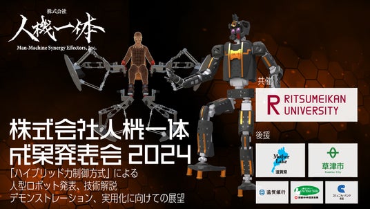 株式会社人機一体(本社:滋賀県草津市、代表取締役 社長:金岡博士、以下「人機一体」)は、立命館大学(滋賀県草津市、学長:仲谷善雄)との共催により、「ハイブリッド力制御方式」による人型ロボットの成果発表会、およびデモンストレーションを実施することをお知らせいたします。御来場のうえ、取材いただきたくよろしくお願いいたします。