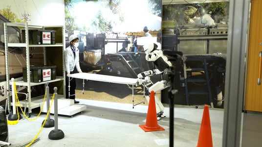 また同展示会での川崎重工業ブースでは、災害時の避難所を想定したシチュエーションでの運搬作業など、自動制御による人との協調作業デモンストレーションが実施されました。