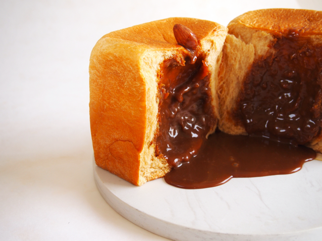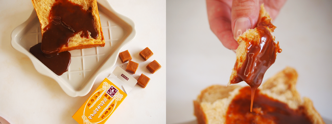110周年ということで、商品のビジュアルデザインにもこだわりました。ただパン生地にキャラメルを織り込むのではなく、パン生地でミルクキャラメルソースを包み込むことで、ナイフとフォークで切り込みを入れるとミルクキャラメルソースが流れ出す、見た目も楽しめる新たな食パンの楽しみ方を提案します。さらに、トーストすると、ソースがキャラメリゼされ、より香ばしさが際立つ食べ方ができます。