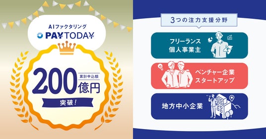 Dual Life Partners 株式会社(本社:東京都港区南青山2丁目)が提供する”即日振込のAIファクタリングサービス (請求書買取)のPAYTODAY”は(URL: https://paytoday.jp )、2021 年1 月15日にサービスリリース後、累計買取 申込金額が200億円を突破したことをお知らせいたします。昨年には、新しい金融手法のサービスメニュー“RBF(レベニュー・ベースド・ファイナンス)”をローンチしました。お客様の資金調達の選択肢が増えればと考えています。