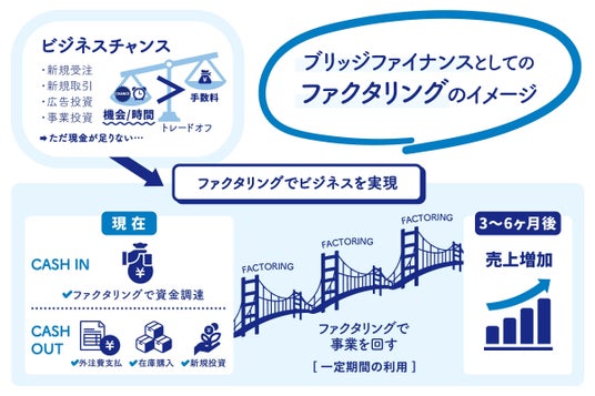 ファクタリングサービスとは、ブリッジ・ファイナンス(新しく資金を得るまでの短期融資)の1つで、請求書等の債権を支払期日前に売却して、現金化できる「借りない資金調達サービス」のこと。これにより、経営者は支払期日前に資金を調達することが可能になり、事業を維持するための、重要な選択肢ともなります。