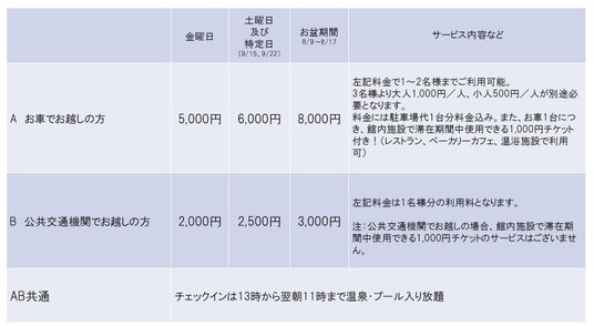 公共交通機関でお越しの場合(駐車場の利用なし)は料金が異なりますので下記料金表にてご確認ください。チェックインはお昼13時~、チェックアウトは翌朝11時で、最大約10時間お楽しみいただけます。