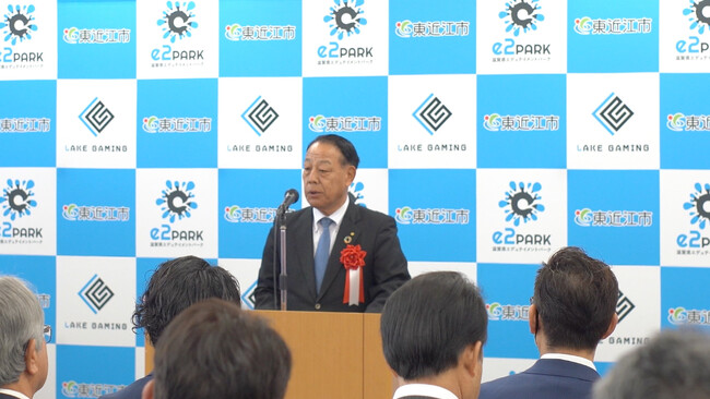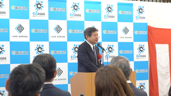 東近江市長 小椋正清様から、地域住民の子どもから高齢者までが、施設でeスポーツやデジタル技術に関わっていただくことで、時代の変化についていくためのきっかけになるような施設になって欲しい、という期待のお言葉をいただきました。