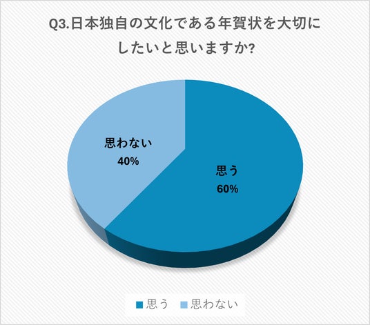 「日本独自の文化である年賀状を大切にしたいと思いますか?」の質問には、「思う(60%)」「思わない(40%)」という回答になりました。