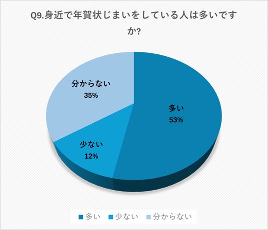 「身近で年賀状じまいをしている人は多いですか?」の質問には、「多い(53%)」「少ない(12%)」「分からない(35%)」という回答になりました。