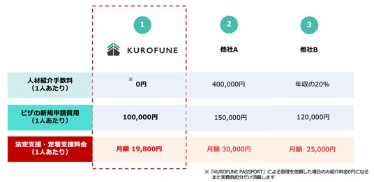 「特定技能」の労働者の法定支援・定着支援アプリ「KUROFUNE PASSPORT」アプリを自社開発し、「人材紹介」ではなく、「定着支援」に重点を置いたサービスです。人材紹介業界では考えられなかった人材紹介料0円でサービスを提供しています。