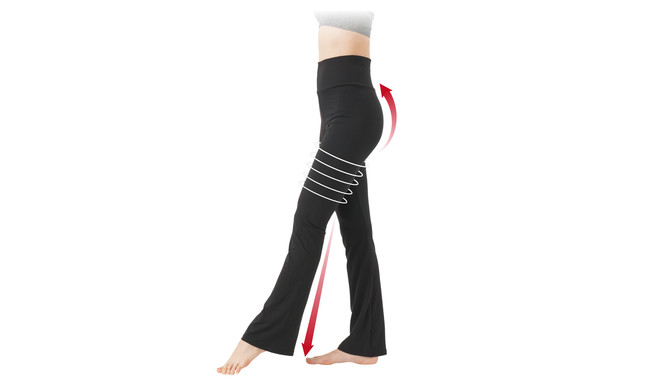 ウエストから太ももにかけて、適度に引き締まったフィット感。膝下は控えめなフレアデザインで美脚を意識。