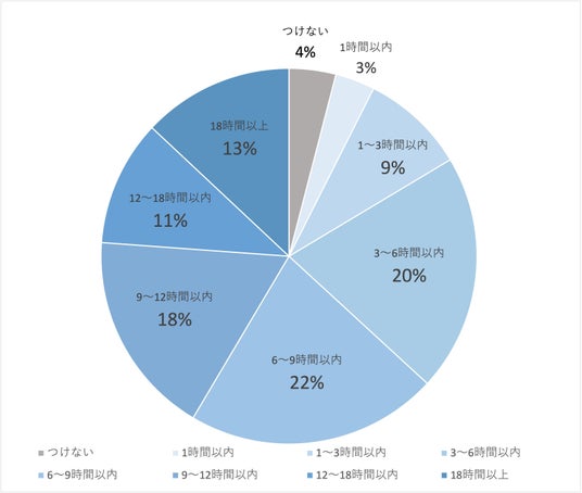 もっともボリュームがあったのは「6~9時間(22%)」の選択肢であったが、回答は「3~6時間(20%)」や「9~12時間(18%)」など満遍なく分布をしていた。
