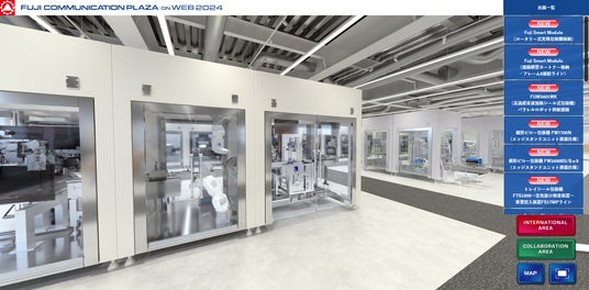 フジキカイエリアはショールームの「THE BASE NAGOYA」の空間を再現しており、現在展示されていない包装ラインの見学や、実際に訪問したことのないお客様には、コミュニケーションホールなどの見学も可能となっております。各ページは日本語ページと英語ページの2種類からなり、各製品は動画とカタログの閲覧が可能です。