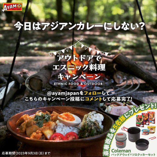公式Instagram@ayamjapanにて、アウトドアでも使いやすいアヤム商品を、コールマンのアイテムとセットにした賞品が当たるキャンペーンを開催します。