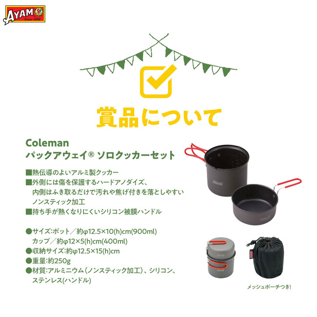 今回はキャンパーさん御用達ブランド、コールマンの「パックアウェイ(R) ソロクッカーセット」も賞品としてご用意しています。