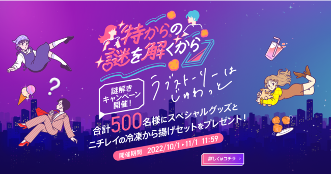 株式会社ニチレイフーズ(本社:東京都、代表取締役社長:竹永雅彦)は、2022年10月1日(土)よりWEBキャンペーン「特から(R)の謎を解くから『ラブストーリーはじゅわっと』」を開催いたします。本キャンペーンは、日本唐揚協会の定める「から揚げ強化月間」に合わせて、ニチレイフーズが展開する毎年恒例の謎解きキャンペーンです。毎年恒例の謎解き企画の第4弾で、10月1日(土)から11月1日(火)までの一か月間、特設サイト内で毎日、から揚げと恋愛オリジナルストーリー「ラブストーリーはじゅわっと」に関する謎解き問題が出題されます。