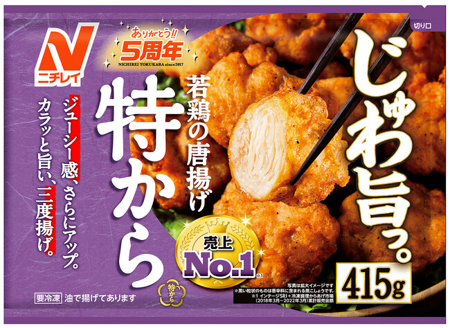 揚げたてのおいしさを再現!こだわりの「じゅわ旨っ。(R)」製法、三度揚げ&香り高い秘伝の醤油ダレで仕上げたボリューム満点の冷凍から揚げ。カテゴリー売上No.1(※)!
