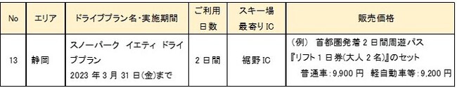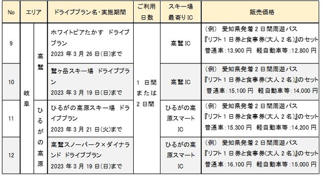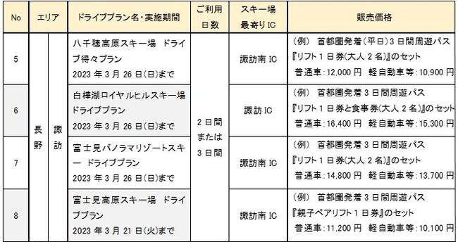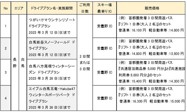 上記プランの詳細については、NEXCO中日本公式WEBサイト「スキーリフト券付きドライブプラン一覧」をご確認ください。https://hayatabi.c-nexco.co.jp/page/?id=176