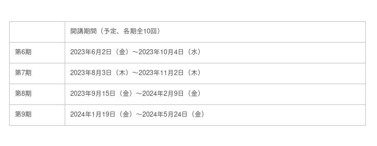※開講期間は予定です。今後、変更になる可能性があります。受付開始時期は、各期開講時期の1ヵ月前から開始する予定です。