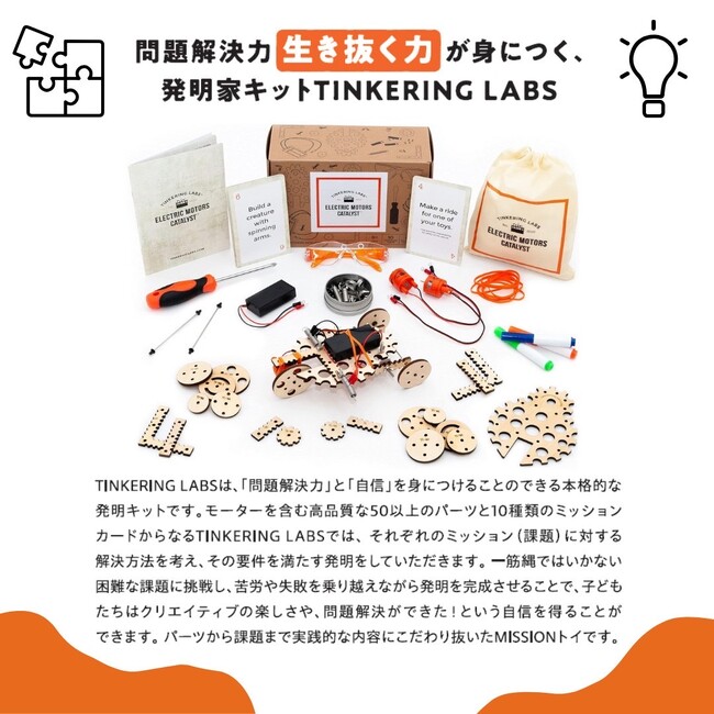 ものづくりを通して「論理的・創造的な問題解決力」や「生き抜く力」「自信」を身につけることができる本格的な発明家養成キットです。