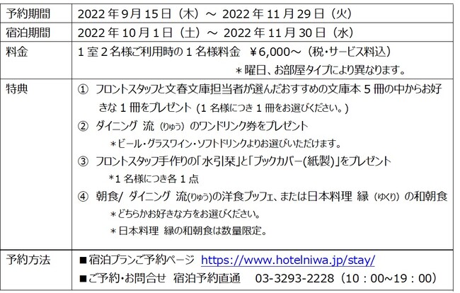 野村不動産ホテルズ株式会社(東京都新宿区/代表取締役社長:青木 秀友)が運営する庭のホテル 東京(総支配人:海老沼 悟、以下「庭のホテル」)では、毎年恒例の文春文庫とのコラボレーションによる人気の宿泊プラン 「秋の読書プラン」を、10月1日より販売(9月15日より予約受付開始)いたします。